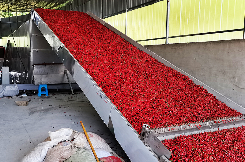 辣椒烘干機(jī)干燥辣椒需要設(shè)置合適的烘干溫度,溫度過高會(huì)破壞辣椒內(nèi)部的營(yíng)養(yǎng)成分,溫度過低會(huì)降低烘干效率。那么,辣椒烘干機(jī)溫度設(shè)置多少合適? 辣椒烘干機(jī)烘干辣椒過程 我們以國(guó)信機(jī)械生產(chǎn)的網(wǎng)帶式辣椒烘干機(jī)為例,先來了解一下辣椒烘干機(jī)烘干辣椒過程。 1、辣椒通過上料輸送機(jī)進(jìn)入烘干機(jī)主機(jī),通過勻料裝置將辣椒均勻鋪在網(wǎng)帶上。 2、辣椒在烘干室內(nèi)做“S”型運(yùn)動(dòng),逐層翻轉(zhuǎn)。 3、熱源提供熱風(fēng),通過引風(fēng)機(jī)進(jìn)入烘干機(jī)內(nèi),熱風(fēng)自下而上穿過網(wǎng)帶及辣椒層,逐層烘干辣椒。 4、烘干的辣椒由出料輸送機(jī)送出。 辣椒烘干機(jī)溫度設(shè)置多少合適? 辣椒的含水率在75%-85%之間,在烘干辣椒時(shí),為了保證烘干效果,溫度應(yīng)該設(shè)定在40°C-60°C之間,這個(gè)區(qū)間烘干出的辣椒,品質(zhì)比較好,顏色和營(yíng)養(yǎng)價(jià)值都不會(huì)發(fā)生太大變化。 當(dāng)然,干燥過程中,還可根據(jù)生產(chǎn)需要對(duì)網(wǎng)帶運(yùn)行速度、溫度和濕度進(jìn)行調(diào)節(jié),以便對(duì)不同含水率、不同品種的辣椒進(jìn)行烘干處理。
