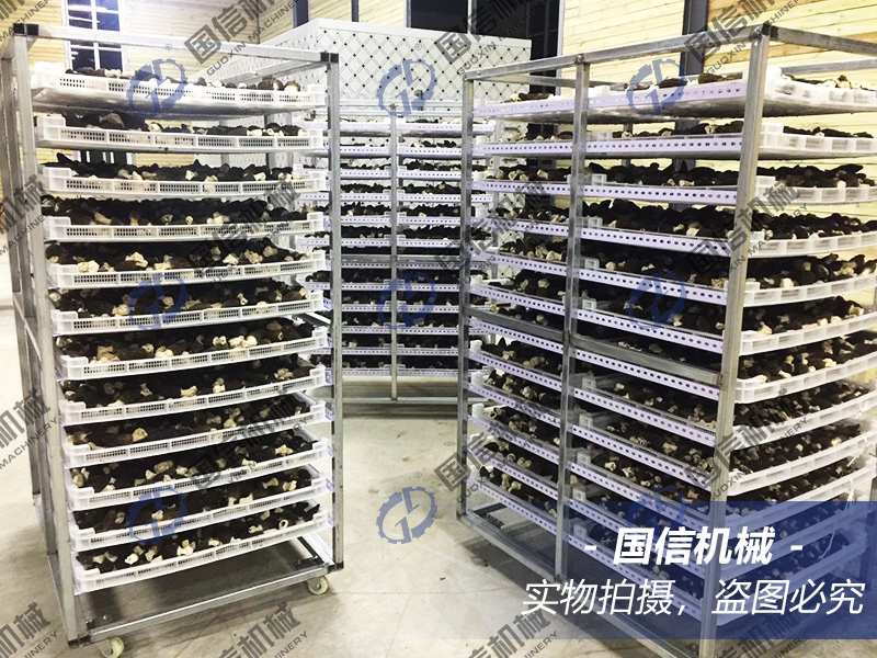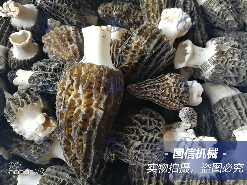 無(wú)需冷藏保鮮的羊肚菌按不同長(zhǎng)度進(jìn)行剪柄后,排放于烘篩上,將烘篩推入烘干機(jī)烘箱內(nèi),緊閉箱門(mén)開(kāi)始啟動(dòng)機(jī)器起烘。起烘溫度不能低于35℃,最好是35℃起烘,濕度控制在70%以內(nèi),時(shí)間3小時(shí)左右,用低溫來(lái)給羊肚菌定性定色,以保證其形狀飽滿,不塌陷。