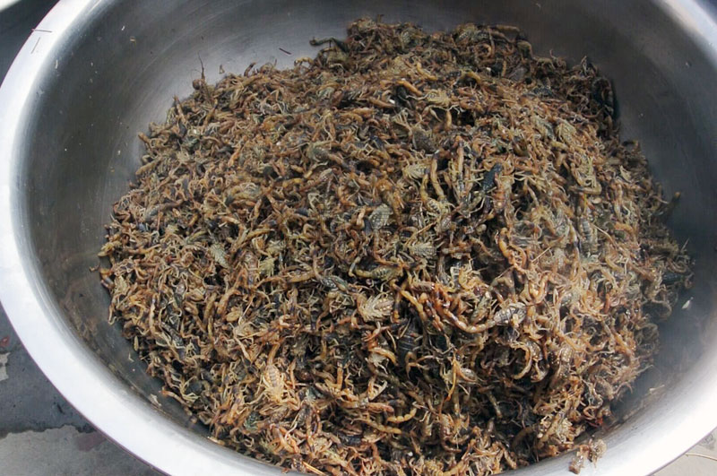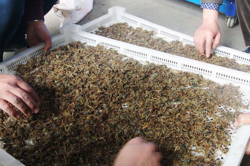 隨后,由我廠技術(shù)人員陪同客戶,為客戶演示整個(gè)加工過程,加工前先把蝎子用冷水浸泡,并反復(fù)沖洗幾次,以洗掉蝎子身體上的泥土和其他雜物,洗凈后撈出,放到事先準(zhǔn)備好的盆內(nèi)。