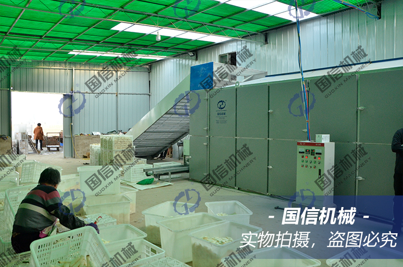 二、烘干的方式 山藥烘干使用的是流水線網(wǎng)帶式烘干,烘干方式是動態(tài)烘干,通過網(wǎng)帶式烘干機(jī)的幾層不銹鋼網(wǎng)帶不停翻轉(zhuǎn),實現(xiàn)對山藥的烘干。熱源一般使用的是燃燒型或者空氣能熱泵,熱量從底部進(jìn)入烘干機(jī)內(nèi)對山藥進(jìn)行烘干,烘干過程中排出的水分從機(jī)器頂部的排濕口排出。我們在烘干山藥時,主要選擇的設(shè)備就是網(wǎng)帶式烘干機(jī),選擇這種設(shè)備的好處是:一、網(wǎng)帶烘干機(jī)的產(chǎn)量比較大,每天的處理量可以從2噸到50噸不等。二、烘干時間短,因為網(wǎng)帶烘干機(jī)是動態(tài)烘干,山藥在設(shè)備中不停翻轉(zhuǎn),所以受熱速度比較快,加熱比較均勻,烘干時間可以縮短幾個小時。