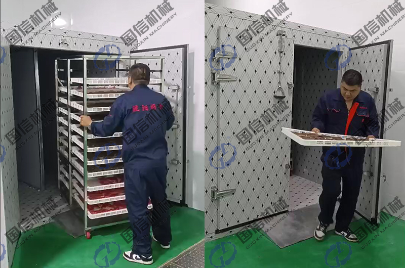 - 烘干:將腌制好的牛肉條,均勻一致的懸掛在烘干房內(nèi)進行烘干,烘干房的熱風(fēng)循環(huán)系統(tǒng)和排濕系統(tǒng),可以提高烘干效率,精準(zhǔn)控溫控濕的智能化操控模式可以使牛肉烘干房的烘干模式接近自然風(fēng)干,保證牛肉干肉質(zhì)鮮美。