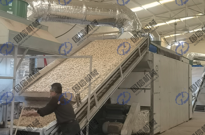 冷水漂洗:漂燙好的鱗片立刻投入氣泡清洗機(jī)的冷水中漂洗至冷,瀝干表面的水分。 熱風(fēng)干燥:把瀝干表面水分的鱗片放入料斗內(nèi),經(jīng)自動鋪料裝置送入百合烘干機(jī)上上層進(jìn)行干燥,溫度控制在60-70℃,在網(wǎng)帶的帶動下,百合鱗片從上層往下層移動。運(yùn)行中,百合片受到翻料器的翻動,同時,百合鱗片有多次往下落的過程,使百合鱗片翻動更徹底。最后,干燥至百合鱗片含水量至10%左右(手摸鱗片發(fā)脆為度),干燥好的百合干片從百合烘干機(jī)底層的出料口排出。